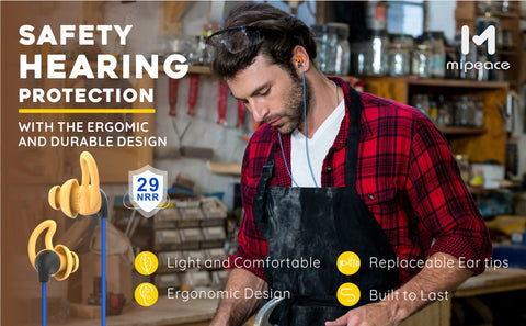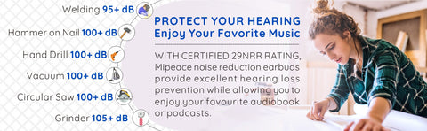 - 【29NRR Noise Reduction】 Mipeace Noise-Isolating Safety Earphones are designed specially to be used to safely listen to music in noisy, rigorous work environments and provides hearing protection with a 29 dB Noise Reduction Rating (NRR). They will significantly reduce all the unwanted noise and will protect your hearing and ensure you will enjoy your music without distractions from ambient noise.